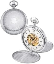 Roman numerals brushed silver plated Hunter Case 17 jewel Skeletonized Mechanical movement case diameter 42 mm mineral glass crystal pocket watch chain deluxe gift box & a lifetime warranty against defects.