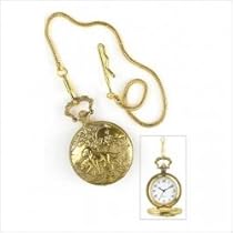 Old-fashioned pocket watch with an embossed hunting scenario. Matching fob chain. Hunting scene may vary slightly. Quartz. 1 3/4" diameter.