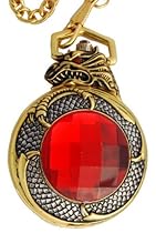 DRAGON wind up pocket watch.Gorgeous gold tone case with huge garnet colored center piece.Classic size pocket watch of 2 inches with a gold tone chain included of approx 13 inches long.This pocket watch has the classic push button feature for when reading the time as well as a gold tone clasp and gold tone linked chain - clip to pocket or belt. Nice standard size of 2 inches diameter that fits snug in the hand. Chain length is approx. 13 inches. Mechanical - wind up movement. Antique styled face. With seperate dials for the seconds and twenty four hour time.