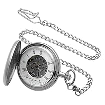 Roman numerals brushed silver plated Hunter Case 17 jewel Skeleton Mechanical movement case diameter 42 mm scratch-resistant glass crystal pocket watch chain deluxe gift box & a lifetime warranty against defects.